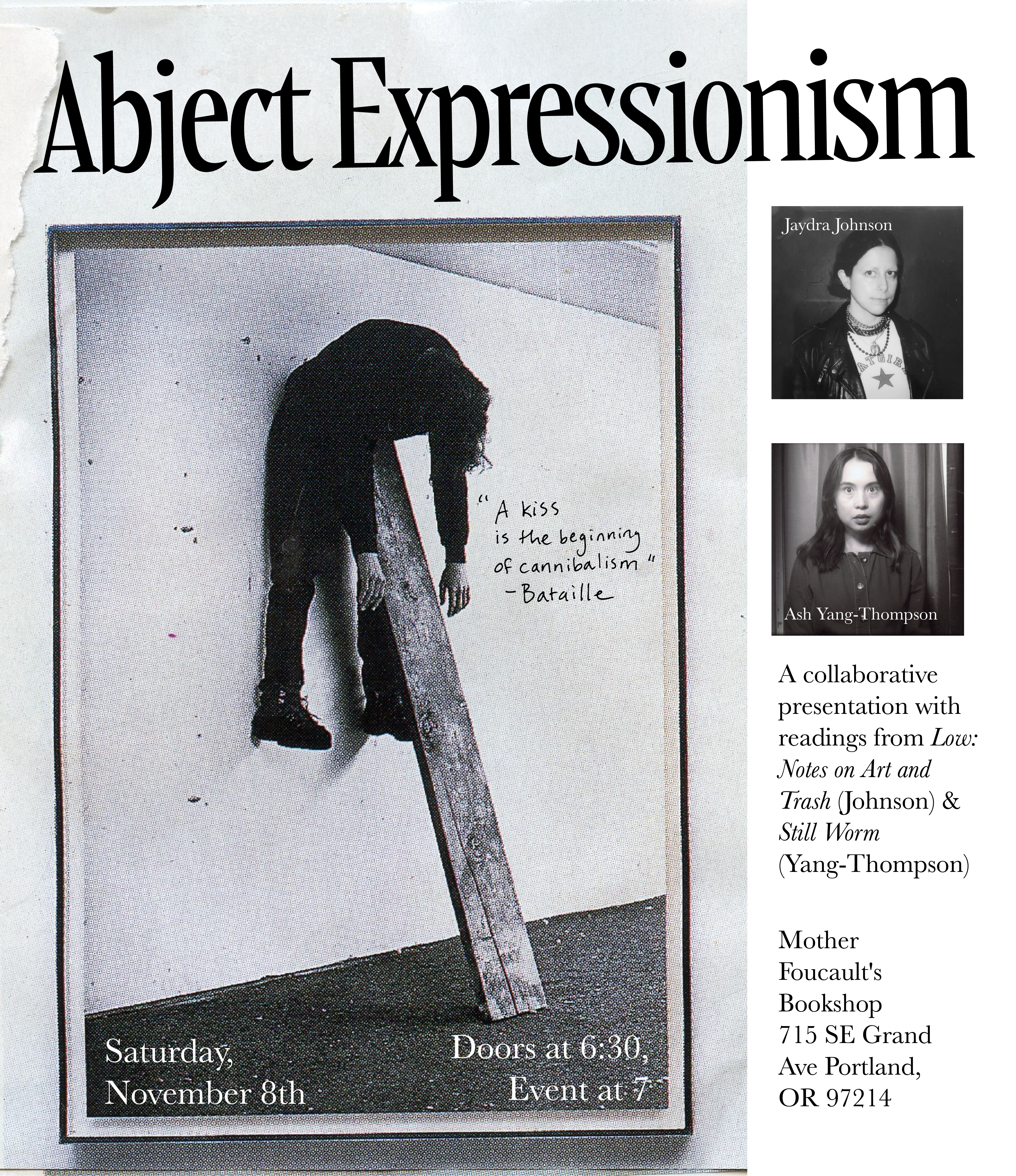 A collaborative presentation with readings from Low: Notes on Art and Trash (Jaydra Johnson) & Still Worm (Ash Yang-Thompson)